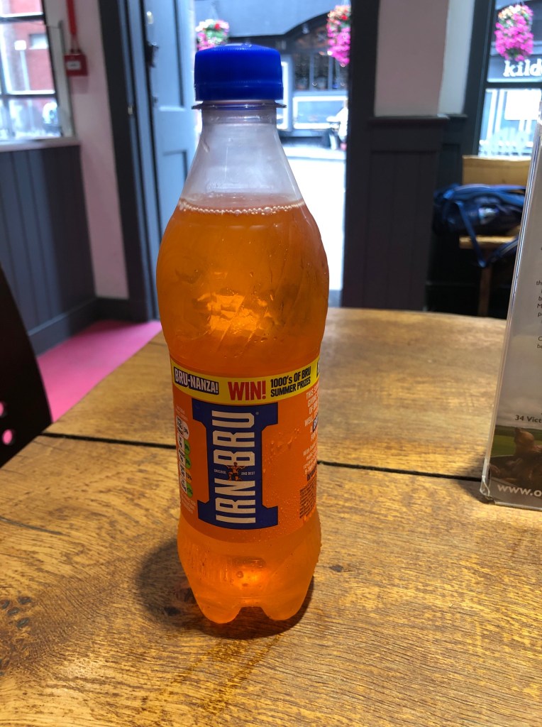 You see this orangey, liquid concoction above? It’s not orange soda, but an Irn Bru (pronounced “iron brew”). What is an Irn Bru? Great Question! It surely does not taste like oranges. I would almost describe it as a banana-y or caramel-y soda. My boyfriend said that the taste reminded him of cold medicine that he used to take as a child. This is not something that I would normally drink. In fact, I’m sure that my eyes skimmed right over it several times before me Scottish friends pointed out the beverage to me. I asked them what’s Scottish, they said try the Irn Bru.