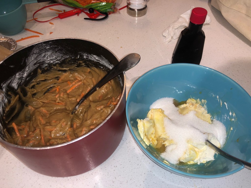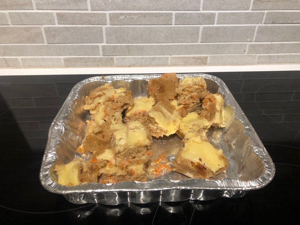 Well, Dear Reader, after this third mistake, I could no longer plow on as intended. Maybe cooking is just not for me. I clearly lack care and patience, two skills I now know are an absolute necessity in the kitchen. However, one thing I do not lack is determination. The very next day, I cautiously approached the kitchen once more. This time I read, read, and re-read a recipe for “carrot cake blondies.” This time, I even bought a pack of 6 8”X8” pans because I learned my lesson. To further minimize room for error I opted to buy shredded carrots, as I was unsure whether I had anything decent at home to undertake the task of thinly slicing carrots.