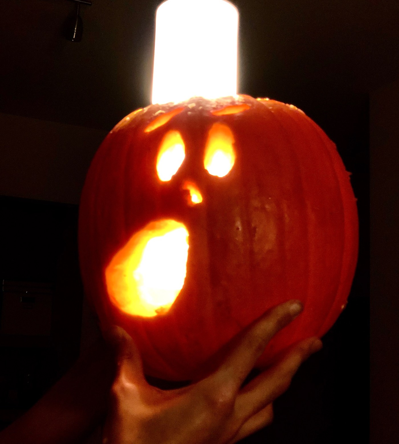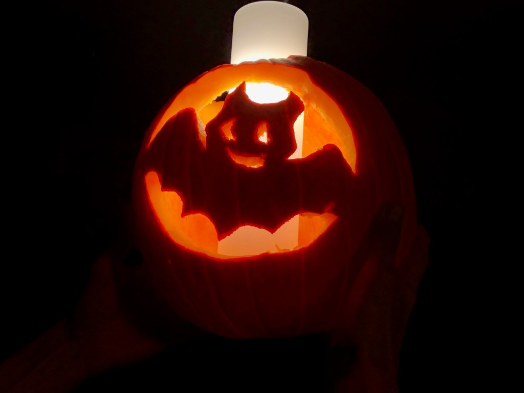 With pumpkin carving equipment in hand, we gingerly removed the pumpkin tops and begun to remove the insides (saving the seeds to roast later). My boyfriend used a stencil to carve a friendly bat and I just winged it to carve a scared-looking face. This experience was extra special for us, because this was my boyfriend’s first time carving a pumpkin! I, on the other hand, have been doing this for perhaps almost two decades as it was a tradition in my family growing up.