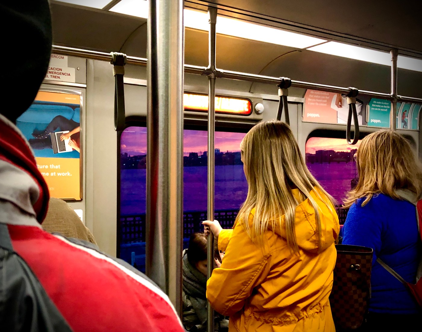 Many passengers found the scene to be fascinating. I saw that I was not the only one attempting to take an awkward phone photo. Unfortunately, I was on the side of the train opposite of the window, which meant that I was poorly positioned for a photo. Regardless, I tried. Above you will see my puny picture of the pulchritudinous scene. Dear Reader, today I witnessed ethereal beauty from a cramped subway car. I hate to say it… but you just had to be there.