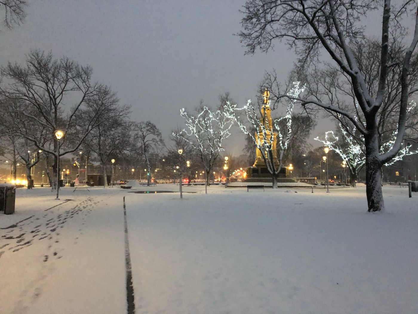 The winter weather this morning was truly something to behold. In the early morning light, everthing is a little brighter when it is reflected off the tiny icy crystals. The muddy, green-brown park is transformed into an ivory field speckled with gray-white trees with bare limbs. I was the first to tred down my block this morning. I was also the first to cut across the parking lot and climb up the small grassy hill to reach the three way intersection. My steps, however, fell in-line with many others imprinted in the snow when I crossed the street onto the opposing sidewalk.