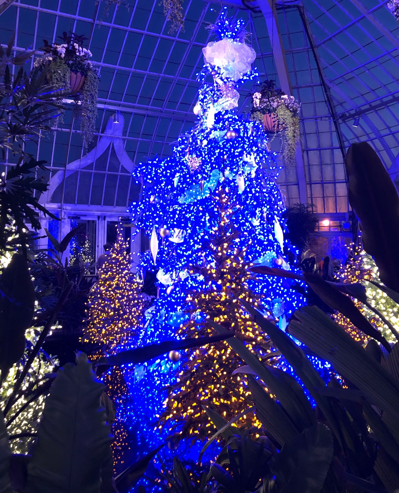 There are many rooms in the Conservatory that house similarly “themed” plants. For example, guests can see large, colorful flowers in the tropical room and pointy succulents in the desert room. All of the rooms showcase light in some way. One room, features a large Christmas tree adorned with blue string lights. In the main entryway, lights hang from the ceilings in halo patterns. The lights at Phipps, however, are extra special for an interesting reason. Visitors are offered special glasses, which make all the lights look like snowflakes. To illustrate this point, I did my best to take a picture of the lights through the glasses with my phone (pictured directly above).