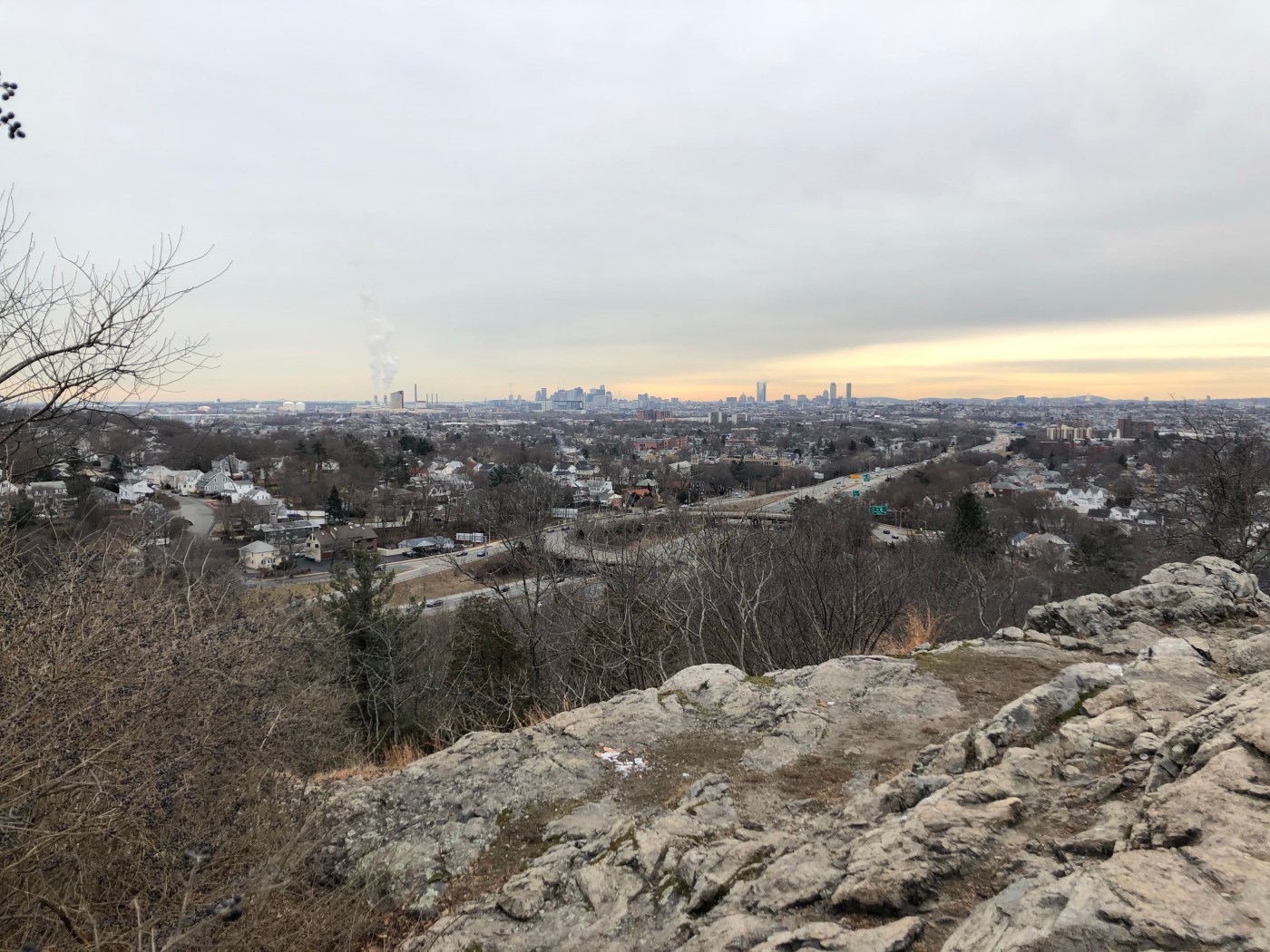 The hike took us by a very beautiful pond. However, the focused and determined group did not take even a 30-second pause to admire the view and instead pushed on down another trail. Somewhere along the white trail, we changed course and followed the orange trail around a dog park and up several more hills. At the highest point, we reached a scenic spot that overlooked Boston from a distance. It’s amazing how much can be seen from that vantage point. From so far away, Everett, Cambridge, Somerville, and Boston all seem like one place rather than separate little communities. It was as if I was taking a picture of the “greater Boston city” skyline from such a distance.