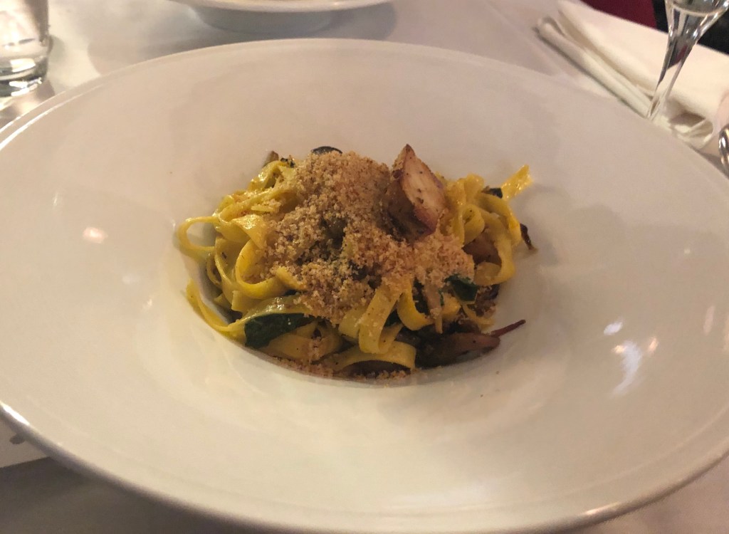The dinner menu was divided into three sections—salads, small plates, and large plates. Dishes included Butternut Squash Manicotti, Crispy Polenta Squares, and Devils on Horseback. As someone with dietary restrictions, it was a very nice experience for me to peruse the entirety of the menu without having to guess whether an unknown ingredient was a meat product. After much deliberation, I decided on the Butternut Squash Manicotti only to discover to my chagrin that the dish was unavailable, so I ordered the Fresh Saffron Fettuccine.