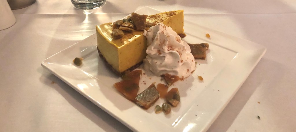 Looking over the menu items, I noticed that many dishes were carbohydrate dense, with a strong reliance on pasta, potatoes, and rice. Even the tofu and seitan meals were merely sprinkled with protein under hearty carbohydrate bases. I’m a protein and vegetable person and even the “large dishes” felt rather light. Our dinner at True Bistro ended with dessert—pumpkin cheesecake and a “chocolate for life,” which was a mocha mousse cake and chocolate cookie with whipped cream. As a cheesecake fanatic, I felt that the pumpkin creation was too sweet and did not have the cheesecake taste (although the look was spot on!)—however, for a vegan product, it was excellent!