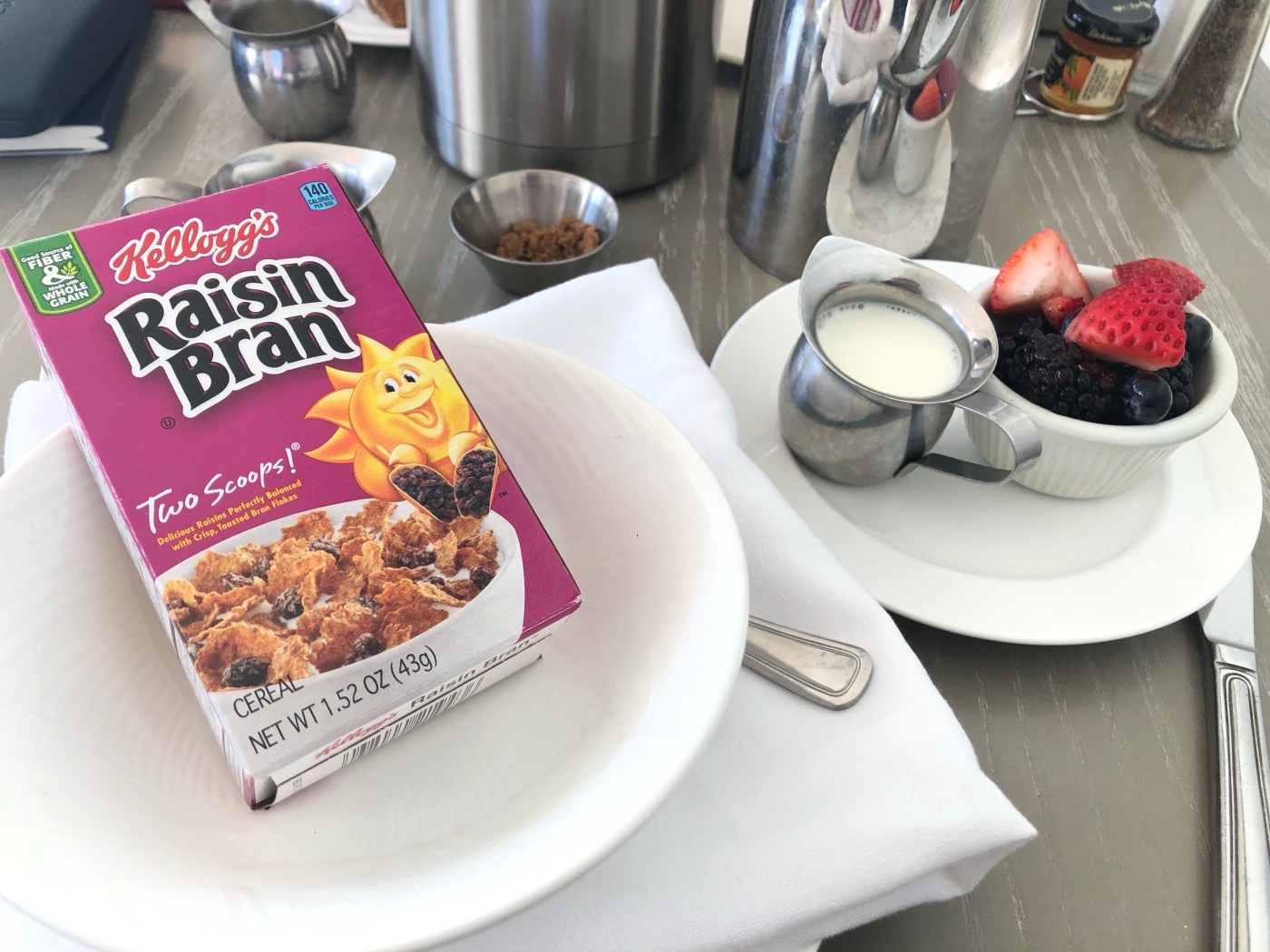 I was able to order another dish, but much to my disappointment, nothing on the menu seemed to be very appetizing. In resigned calm, I ordered the Raisin Bran—a cereal of my youth served to me in a small bowl (a mere 140 calories) with a tiny cup of berries, and even tinier dispenser of milk for the cost of ten green, American dollars. Ten bucks, Dear Reader. You can buy a family sized box of cereal for $4.99, a gallon of milk for $3.99, and for the berries—who cares, it’s Raisin Bran.