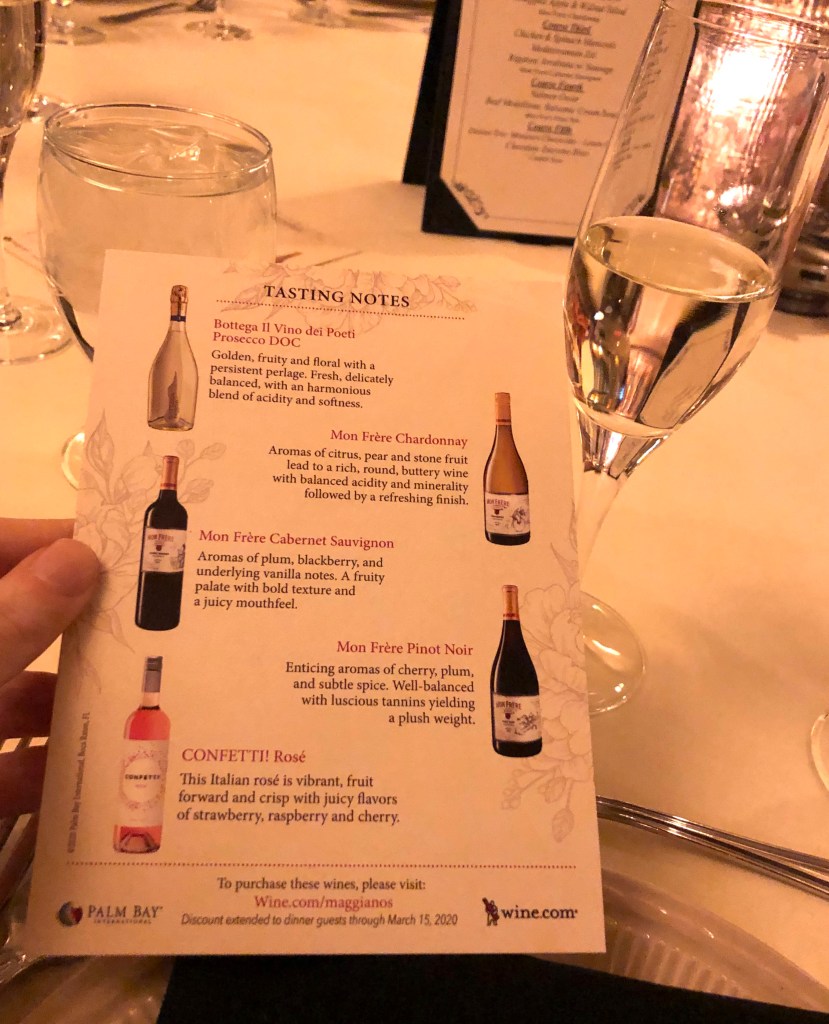 The event began in earnest with the sommelier standing in the front of the room holding a microphone in one and a golden bottle of prosecco in the other. He explained that the gold colored bottle kept the goodness in and the light out, preserving the sparkling quality of the bubbly beverage. The two sisters to our left were giddy even before we ingested our first glass; it was one of the sister’s birthdays and we all congratulated her. Next came the “Mon Frère Chardonnay,” which was described as a citrusy aroma with a rich, buttery taste and served with a salad. I have tried a bunch of chardonnays—many of which were cheap from Trader Joe’s—but this one stands out for its ‘elevated’ taste. The two sisters enjoyed the wine so much they somehow finagled a second glass each from the server.