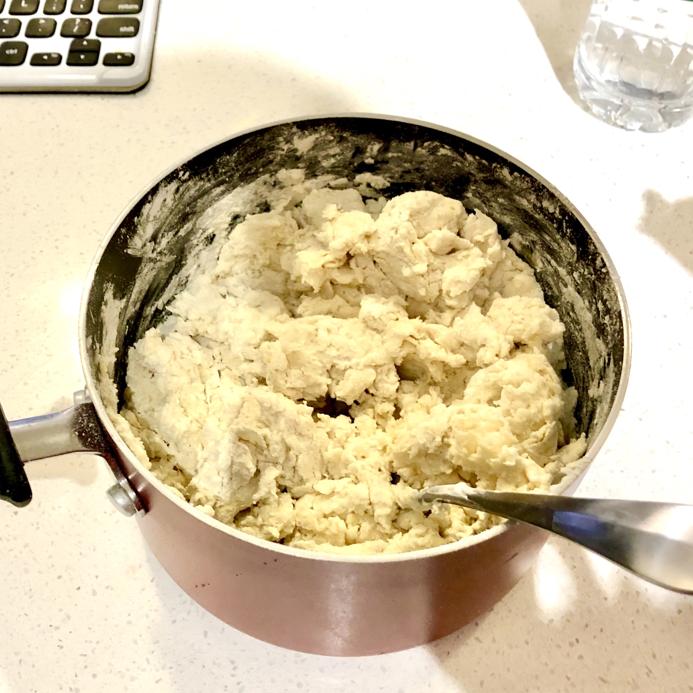 The ingredients list is simple: plain flour, garlic powder, baking powder, sea salt, plain Greek yogurt, olive oil, and milk. Because I do not have the pantry or toolkit of a chef, I had to DIY a few elements of this recipe. For example, I had some sour cream left over from a previous baking adventure so I substituted some of the yogurt for sour cream so I could finish off the container. Also, I ended up using table salt instead of sea salt and whole milk because it was all that I had. Additionally, when it came time to prepare the dough instead of using a rolling pin, I used my palms to press and shape the soft blob. Once the dough was divided and rolled out into eight pieces, it was time to cook it on the stove.