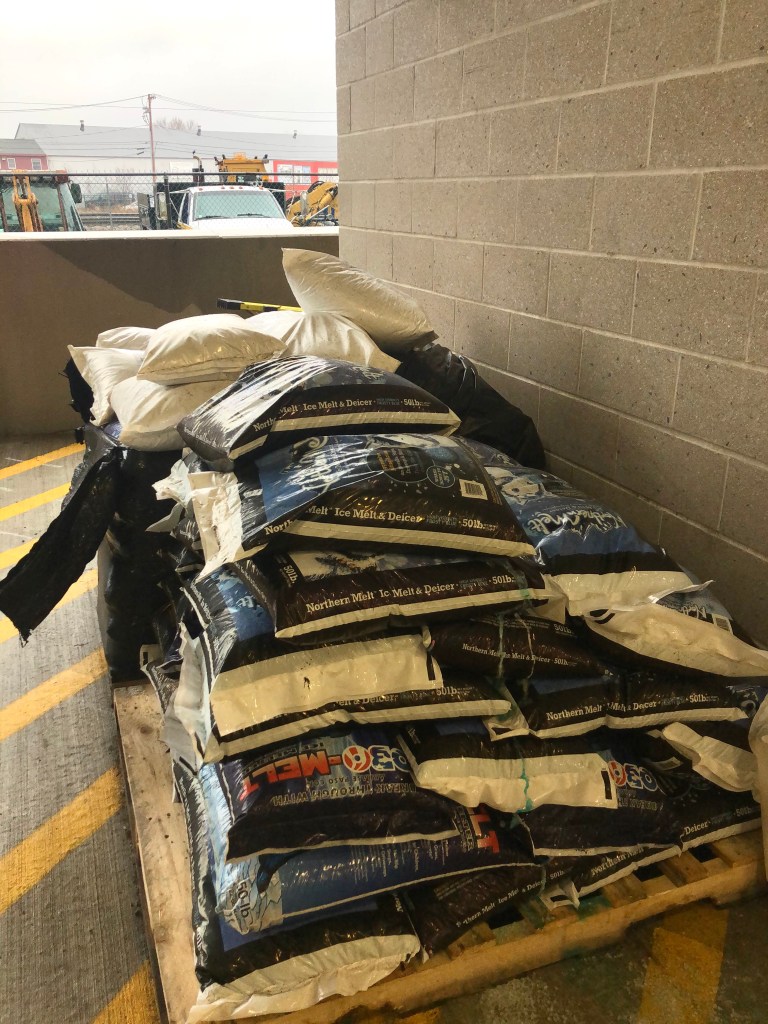 At the entrance of the parking garage, I saw a stockpile of rock salt in bags piled on top of each other. Immediately, I recognized this as an opportunity to perform weighted squats and lunges. I set down my phone and went to pick up one of the bags—my goodness it was heavy! I later noticed that each sack was listed at 50 lbs. While the bag was cumbersome to lift from the stack, once I had a good grip on it, it was very manageable to use for exercise.
