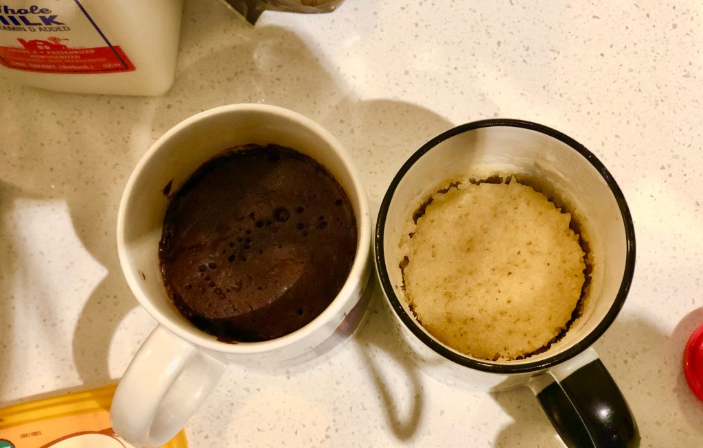 Have you ever had a mug cake? These little treats are single-serving cake recipes that are “baked” (microwaved) in a normal 12 oz coffee mug. Mug cake recipes are perfect for me at the moment because my sack of flour is nearly depleted, and a mug cake only requires three to four tablespoons of flour each. For a quirky dessert, I decided to try two mug cake recipes for a nice evening with my boyfriend. After browsing a few different recipes, I decided to keep it simple and go for a chocolate and vanilla mug cake.