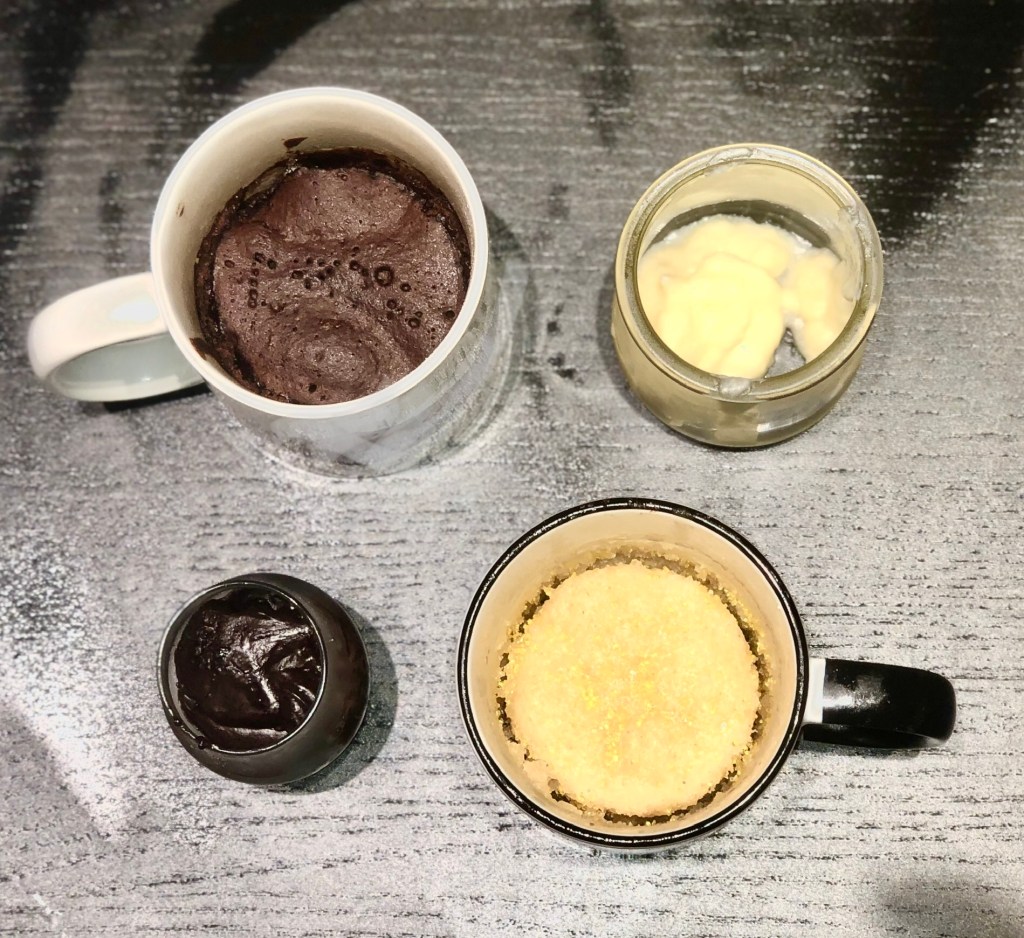 Overall, the cakes turned out with mixed results. The chocolate cake was fabulous! It was moist and paired well with the frosting. As for the vanilla mug cake… I’m glad that I had prepared that one for myself, because I would not want to serve that to another human being. The cake had a rubbery texture. Perhaps, this was because I substituted the egg yolk for a tablespoon of milk. Egg yolks give cakes more moisture, which I missed out on by making this substitution (which was sanctioned by this recipe). Personally, I was also not a fan of the frosting, as the added sugar to the frosting did little to mask the buttery base. Regardless of the outcome, the experience of preparing two tiny dishes was worth it for the amusement of the procedure alone.