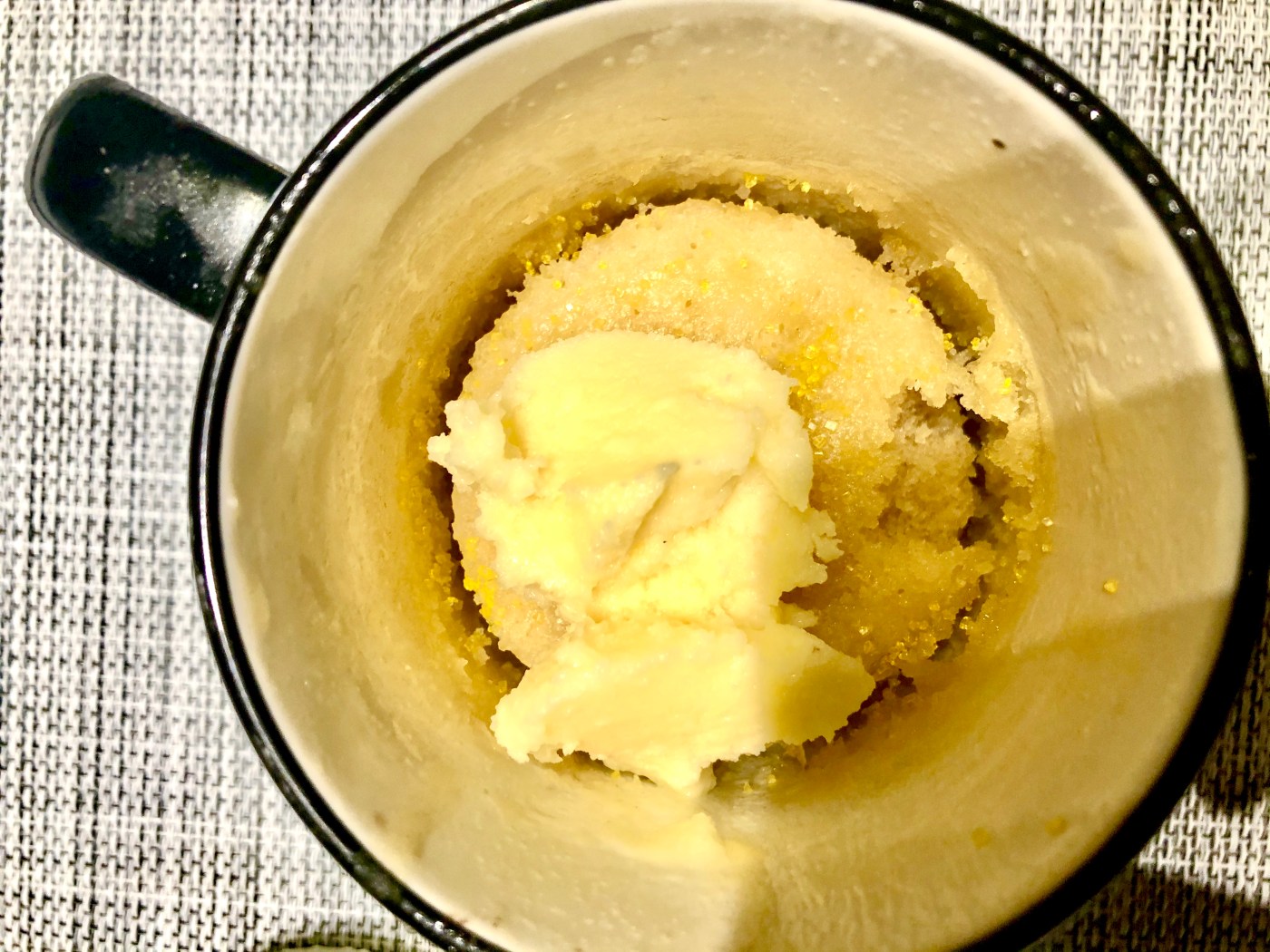 First, I began to prepare the chocolate mug cake with this recipe. The recipe called for flour, brown sugar, cocoa powder, baking powder, milk, canola oil, vanilla extract, and semisweet chocolate chips, all in modest proportions. Due to ingredient availability, I substituted olive oil for canola oil, used dark chocolate cocoa powder (an upgrade!), and had to omit the chocolate chips. The recipe is straightforward and the combining of ingredients can take place directly in the mug. Before I put the chocolate batter into the microwave, I combined the vanilla mug cake ingredients, which included unsalted butter, milk, vanilla extract, an egg yolk, white sugar, flour, baking powder, and sprinkles. The recipe suggests that an egg yolk may be substituted with a tablespoon of milk, which I did to spare our modest egg supply.