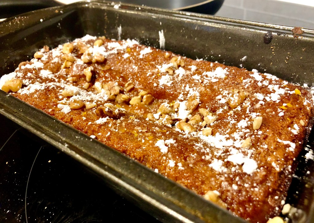 In the oven, the loaf modestly rose, browned around the edges, and firmed up in the middle. After forty minutes (and a few crisp edges), I removed the pan and began to make the cake topping. The warm glaze was a mixture of orange juice and honey. While the concoction was sweet, I was reluctant to dump the liquid onto this delicate little cake that actually turned out better looking than I had hoped. Regardless, I did as the recipe said and the nice liquid soaked right in and the cake had a sweet citrus aroma. Lastly, I mashed up a few pieces of walnut and sprinkled those along with powdered sugar on top of the cake.