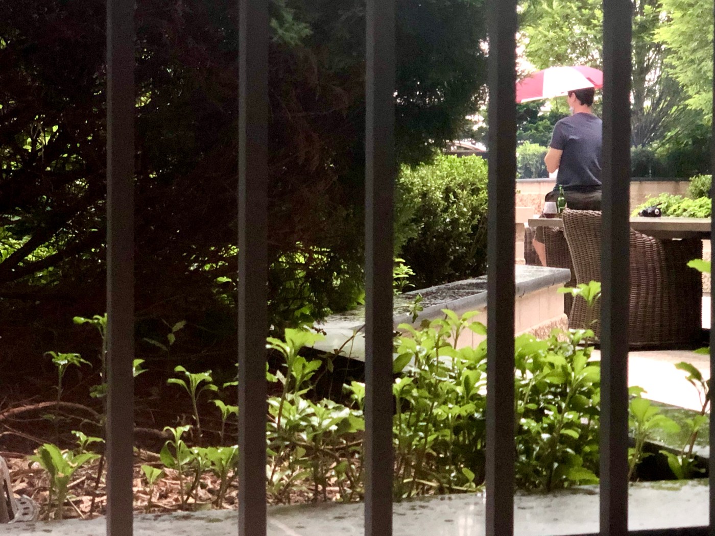 The man continued to stand by the grill and the smell of burgers was mouthwatering, even though I have not eaten beef in a number of years. I could see the glow of the fire pit in the distance and could hear quiet female chatter from the other end of the courtyard. Again, I wondered, “why don’t they just pack up and eat inside?” But no, they each picked up their burgers, ate and sipped their drinks in the (now lighter) rain. The man too picked up a burger but chose to consume it standing without the protection of his large umbrella.