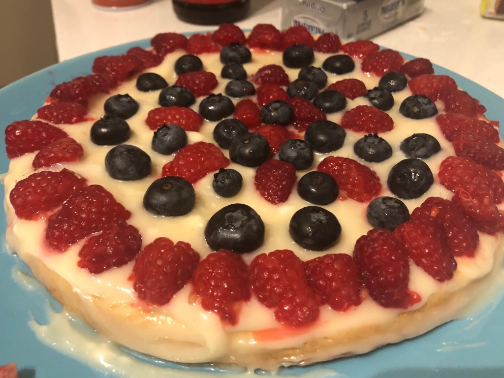 In the afternoon, to really ramp up the revelry, I began to cook and bake for a lovely, low-key evening in with my boyfriend. In an ode to American cuisine I cooked burgers and hot dogs (both vegan) and prepared a tossed salad with sides including corn on the cob. For dessert I attempted this tricolor giant sugar cookie with fruits and icing to mimic the spirit of the star-spangled banner. It came out better than expected and the fun of baking it makes it more valuable to me than any store-bought confection.