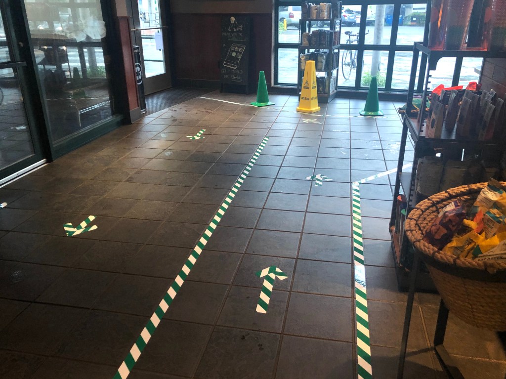In Starbucks, the floors are lined with “one way” tape guiding (nay, mandating) that customers follow the strict snaking pattern from the front door to the counter. When I approached the counter, I was greeted by a large glass window separating the customers from the baristas. Hesitantly, I ordered a tall Americano — I should mention that this, incidentally, is the first Starbucks coffee that I have ever ordered for myself as I only started drinking coffee during the pandemic (more here). I received my cup and paid. In this no-contact world, paying with cash now means dropping your bills onto a tray for the cashier to collect. While this is a pandemic-era change in the U.S., I must admit that I am very familiar with this process as this is how the Russians collect cash and dispense change (for superstitious, rather than germaphobic, reasons; I should also mention that I am not Russian, I just studied abroad in the country). Awkwardly, I took my cup of coffee and a small cup of milk—the milk/ sugar/ napkin stand is no longer a fixture at the café—and tried to open my large umbrella without spilling everything.