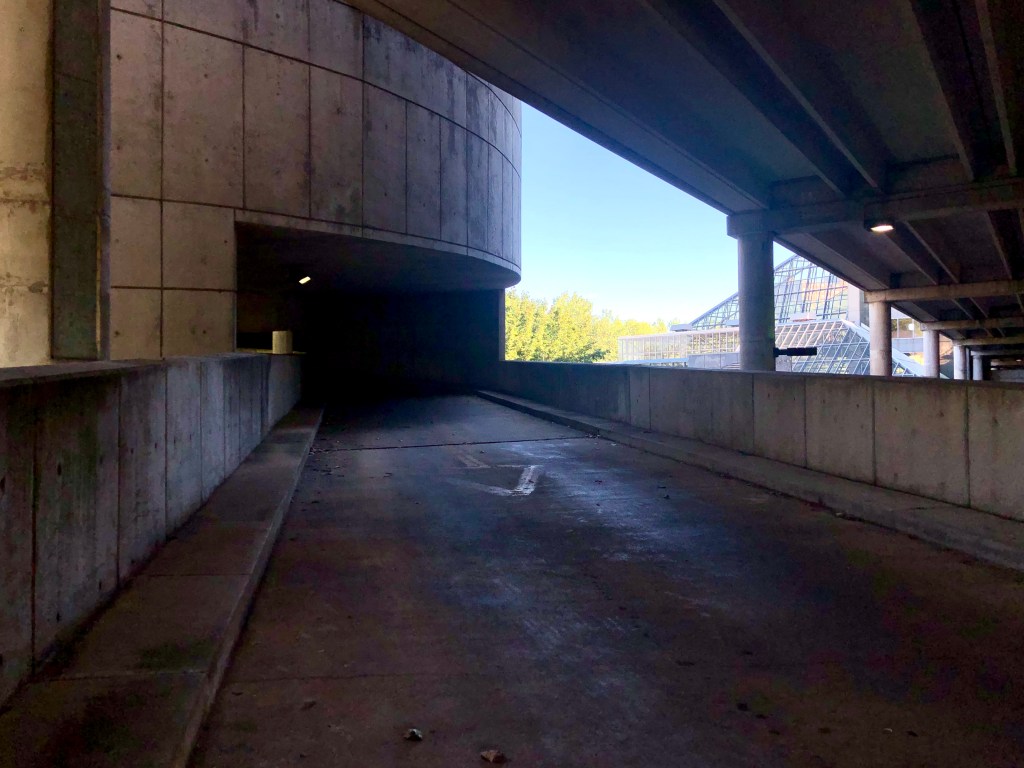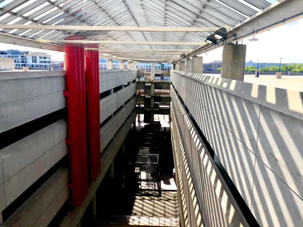 Finally, we decided to head back down, but this time, we took the stairs. The parking garage has different levels, but the top few are completely empty. Concrete, metal, and glass in all directions kind of gave me the feeling that we were entering into some sort of dystopian scene. But, sure enough, as we descended to the lower levels of the station, the parking spots were filled with cars and the benches with people.