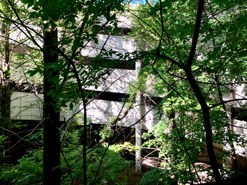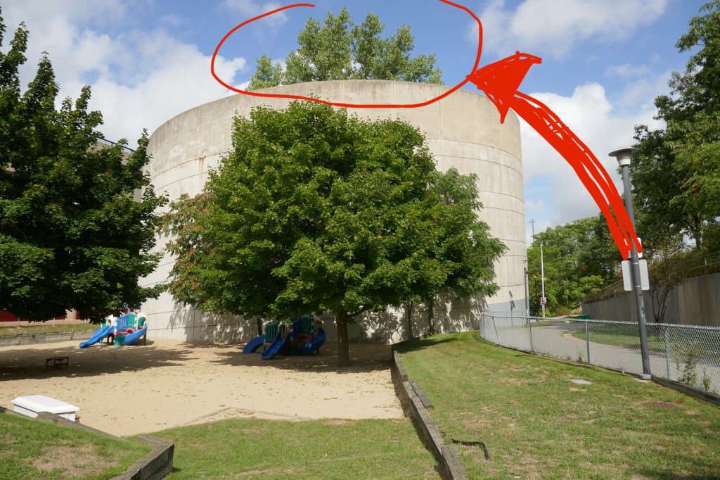 Heading north from Summer Shack, we traversed the vacant parking lot and crossed the street to where the Alewife “T” station sits. Just behind the station lies the Alewife Brook Reservation, a nature spot and walking path (more here) that I was planning to visit. However, as we were walking around the exterior of the “T” station, I pointed out something peculiar. There was a very tall tree peeking out behind the stone walls of the station (see pic above). We wondered whether the tree we saw was really so tall or, perhaps, it was planted on some sort of higher level. Intrigued with nowhere to be, we went to investigate.