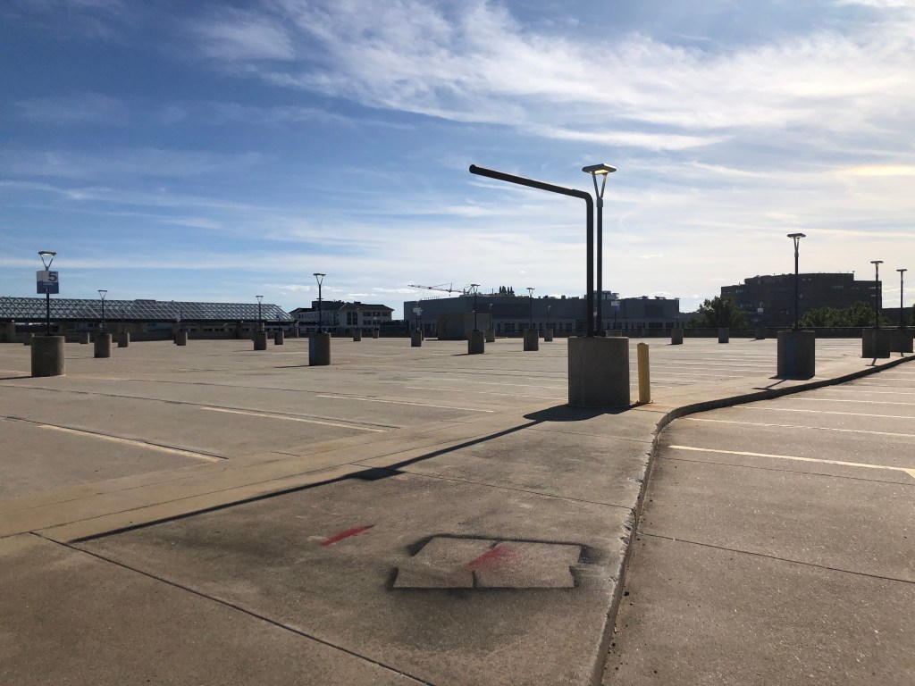 We continued to snake our way up the ramp and were pleased to discover that this section of the parking garage was closed off to cars. For this reason, the top level of the parking garage was stark empty. There was so much space up there and one could see the city for miles in all directions. To the east, we could even see the city of Everett, where the Encore Boston Harbor hotel and casino is located (more here). It all looks so beautiful from the top. We took plenty of photos as we drank in our surroundings. We even regarded Summer Shack from this new height. It’s amazing how different things can look when you change your perspective.