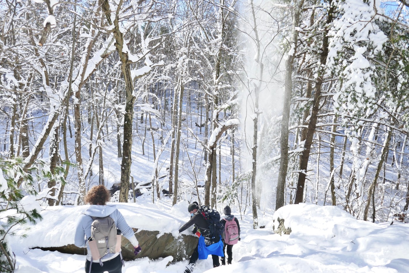 Unlike the unseasonably warm Saturday mornings, on this morning when I arrived at the Blue Hills Reservation trailhead, the parking lot was half empty instead of packed to capacity. The snow sparkled in the freezing temperatures, but I felt comfortable under my four layers. It seemed like others were feeling similarly, as more than one person “de-layered” before we had even begun our hike. Once everyone was in attendance, the decision was made that a few members would wear their snowshoes. Snowshoes are gear that straps onto the boot to help increase your surface area and allows you to stay afloat in the deep snow. The snowshoes were particularly helpful in this case to help clear the path of unpacked snow. Everyone without snowshoes (like moi) put on their microspikes to prevent any slipping on the trails.