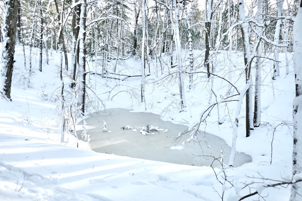 The start of the hike was pleasant as we were in awe of the sparking snow-covered trees and trails. The frozen ponds were a grayish white against the untouched snow, which gave the scene a painting-like appearance. The beauty could not distract us for long, however, as the snow made every step a laborious one. Not more than 15 minutes into our journey, we stopped for a water and de-layering break. I could not help but think, “My! This is going to be a long one!”