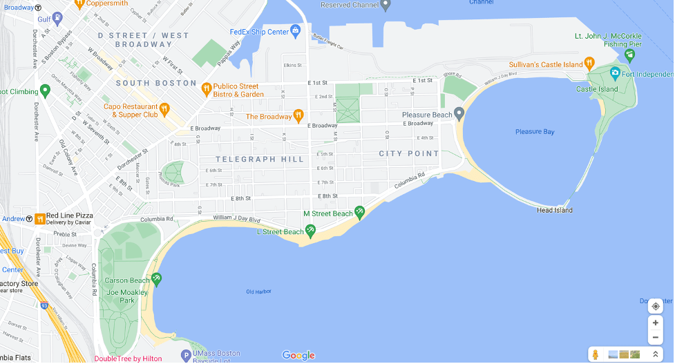 When you picture Boston, you’re probably not picturing beach front property. However, Boston is located on the water (how else could we have thrown the tea into the Harbor?) and its coastline is sublime. The beachfront that I visited is located in South Boston (pictured below, from Carson Beach to Castle Island).