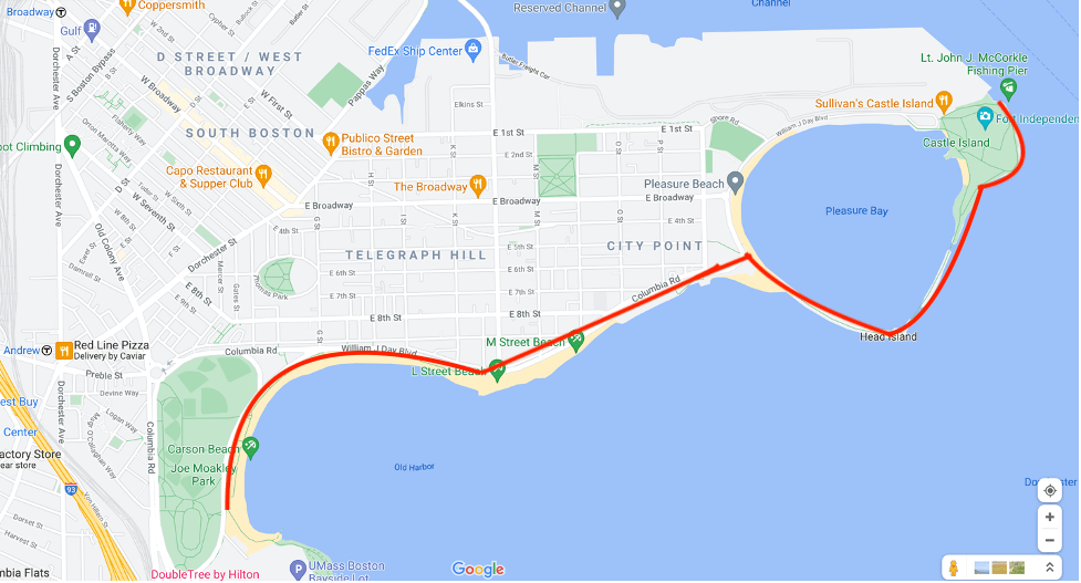 Altogether, the walk from Carson beach to Fort Independence via the Pleasure Bay causeway is about 2.75 miles of beautiful water views.