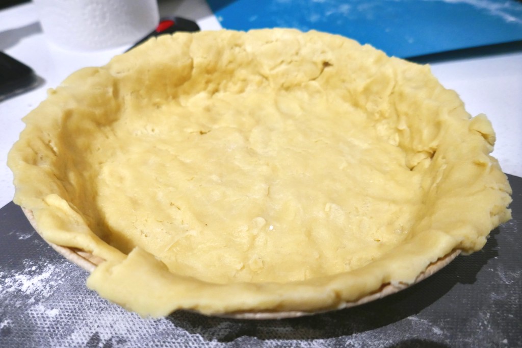 - Place the stretched-out dough in the pie tin. Press the dough so it covers all the edges