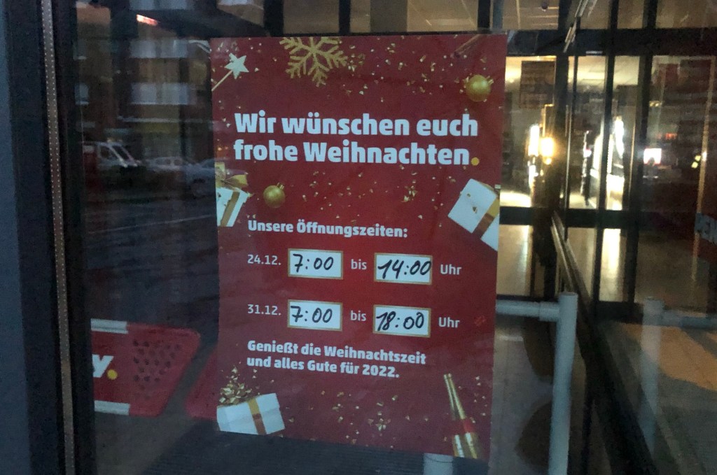 Berlin and other bigger cities operate more normally zwishchen den Jahren, which is good news if you plan on celebrating the holidays in Germany. But still, it’s good to look ahead for closures and check out the store hours in-person or over the phone as Google maps is not a reliable source in these instances.
