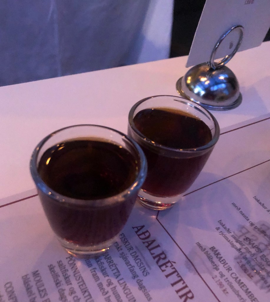 One evening, feeling mentally drained from lectures and remote work, I returned to my hotel room, craving social interaction. Contrary to my introverted nature, I spontaneously asked my roommate if she would like to get cocktails in the hotel restaurant. I had low hopes that she would accept as it was after 9pm and she was typing away diligently on her laptop already wearing pajamas. However, maybe the lightness of the evening sky and the urge to socialize was weighing on her too as she was quick to accept my invitation. Downstairs, we ordered a paloma and a negroni from the much-too-friendly waiter. After some light-hearted confabulating, the waiter returned with a dark bottle and two shot glasses. He insisted we do a shot of some Icelandic liqueur with a licorice taste like Jägermeister. Neither of us were very interested, but as the waiter looked on from a distance at the bar, we acquiesced, clinked our glasses, and took small swigs of the shot. It wasn’t half bad, which surprised me as I literally have not done a shot in years. It was near midnight by the time we left the restaurant and the sky although much darker was still not pitch black. Then, just like college, we woke up early the next day and went to lectures.